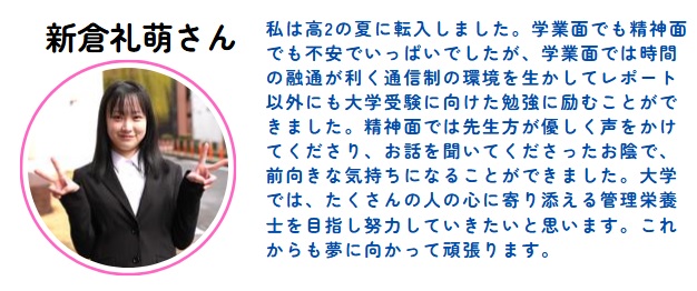 先生がとても身近に感じられて相談もしやすく楽しく学校生活がおくれました。短い期間でしたがありがとうございました。